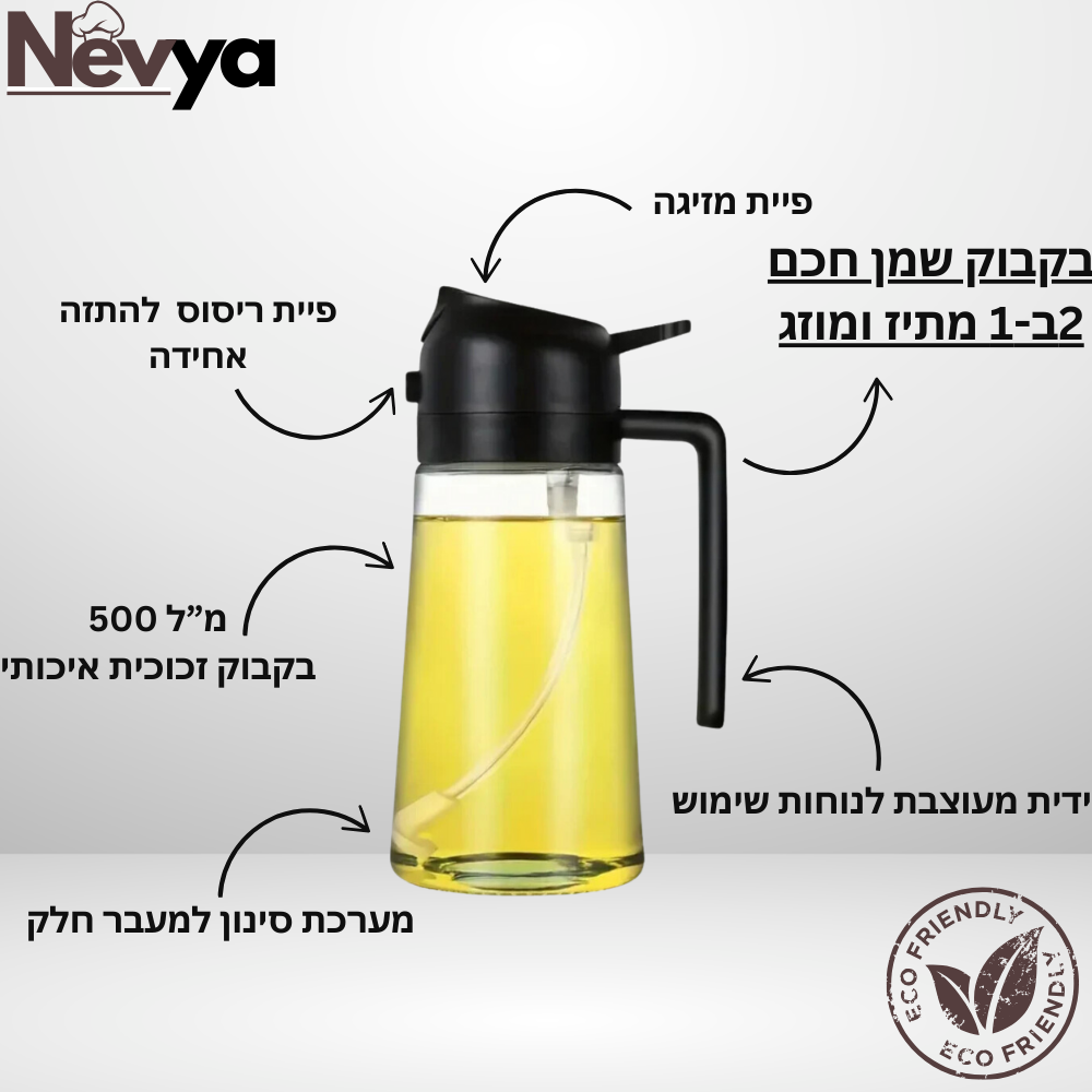 בקבוק השמן 2 ב-1 שלנו מציע שילוב ייחודי של ריסוס ומזיגה, המספק שליטה מדויקת בזרימת השמן ועוזר לשמור על כמויות מדויקות ובריאות.