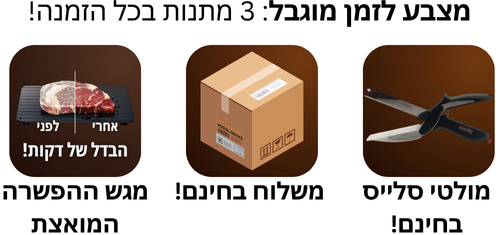 *לאור המצב הבטחוני קיימים עיכובים שוטפים במשלוחים לרחבי כל הארץ, אנא לגלות סבלנות