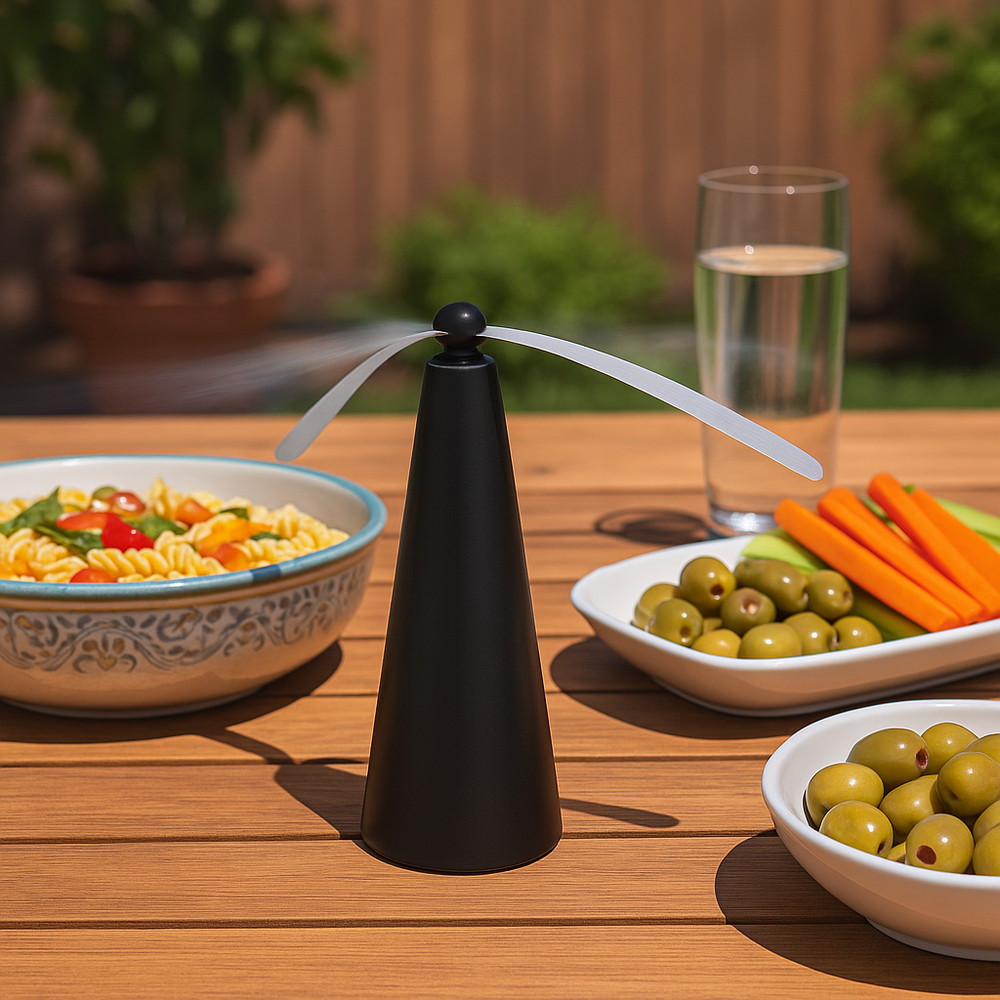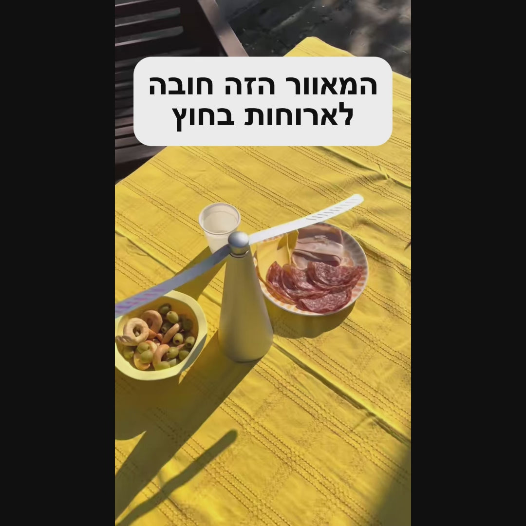 המאוורר השקט שמרחיק מעופפים מהשולחן שלך לפיקניקים, ארוחות בגינה או מנגל. פתרון אלגנטי בטוח, ונעים. פשוט מניחים והוא עושה את העבודה